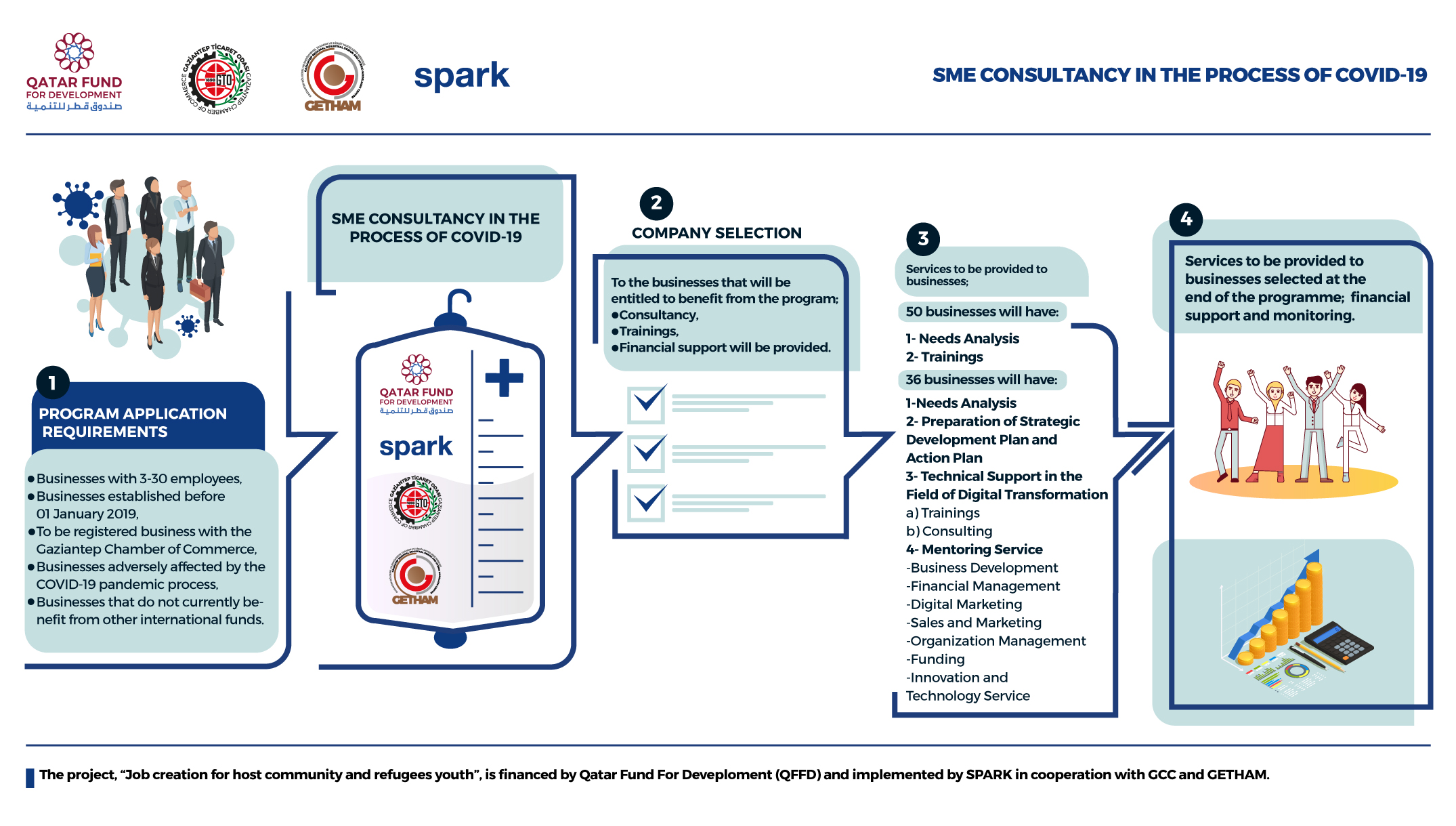 The “SME Consultancy in The Process of COVID-19” was initiated with the cooperation of Gaziantep Chamber of Commerce (GTO), SPARK, GETHAM (Gaziantep Industrial Design and Modelling Center) funded by Qatar Fund for Development.